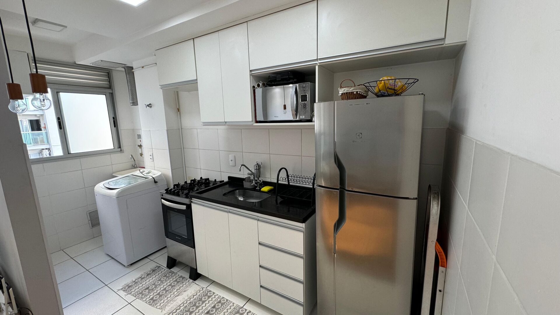 A cozinha em conceito aberto integra-se harmoniosamente à sala e dispõe de área de serviço anexa, tornando o dia a dia mais funcional. O banheiro social possui box em blindex e armário sob a pia. O apartamento conta ainda com direito a 1 vaga de garagem no parqueamento.